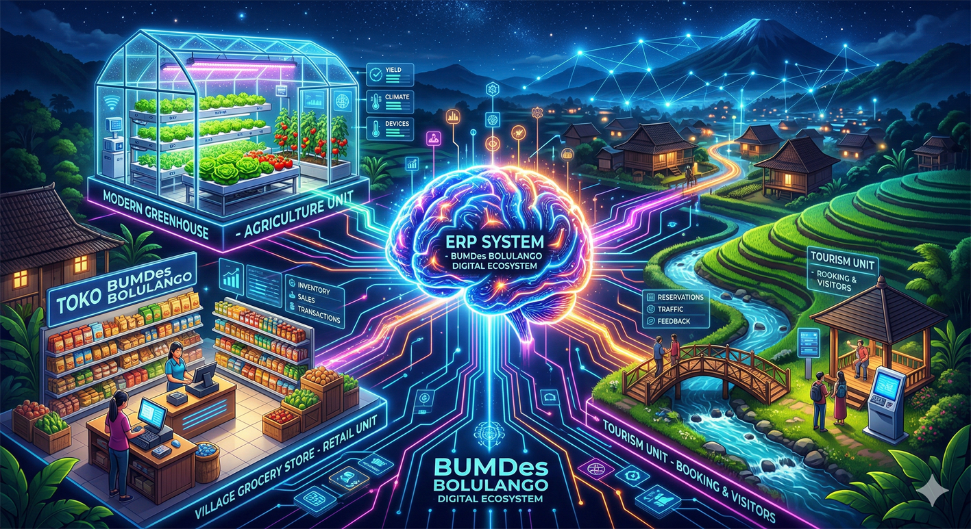 ERP (Enterprise Resource Planning) adalah paket perangkat lunak modular yang mengintegrasikan komponen utama bisnis (Keuangan, HR, Produksi, Penjualan, Logistik) sehingga data mengalir secara otomatis antar departemen tanpa input ulang.